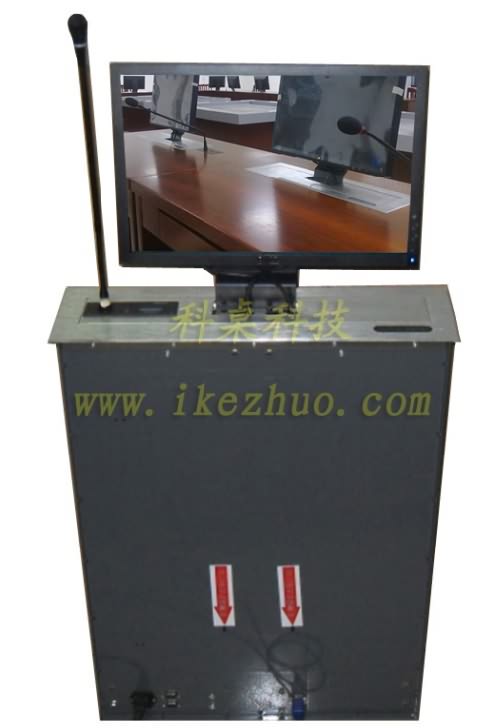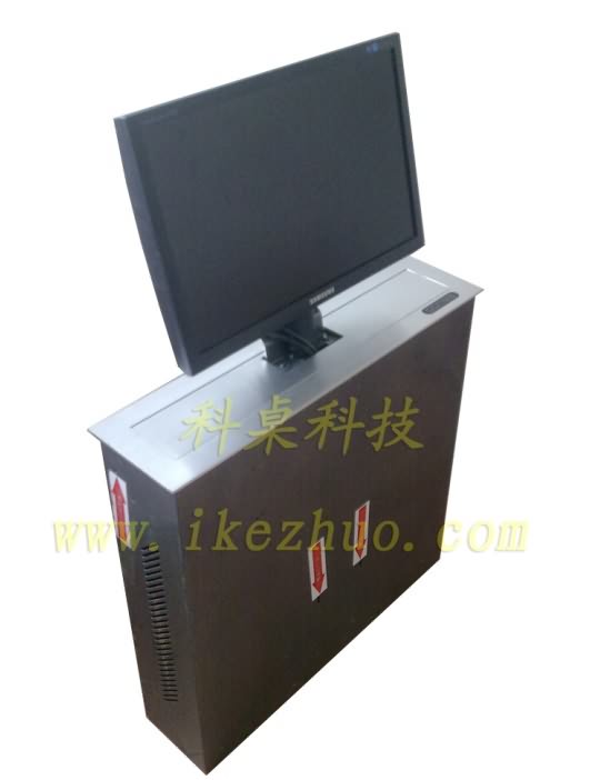 19寸科桌液晶屏升降器需要使用顯示屏時,隱藏在會議桌內部的升降機把顯示屏從會議下面升到桌子表面;當不使用顯示屏時,升降機自動下降,顯示屏隱藏在會議桌內部,防盜、防塵;保持桌子表面的平整和美觀。