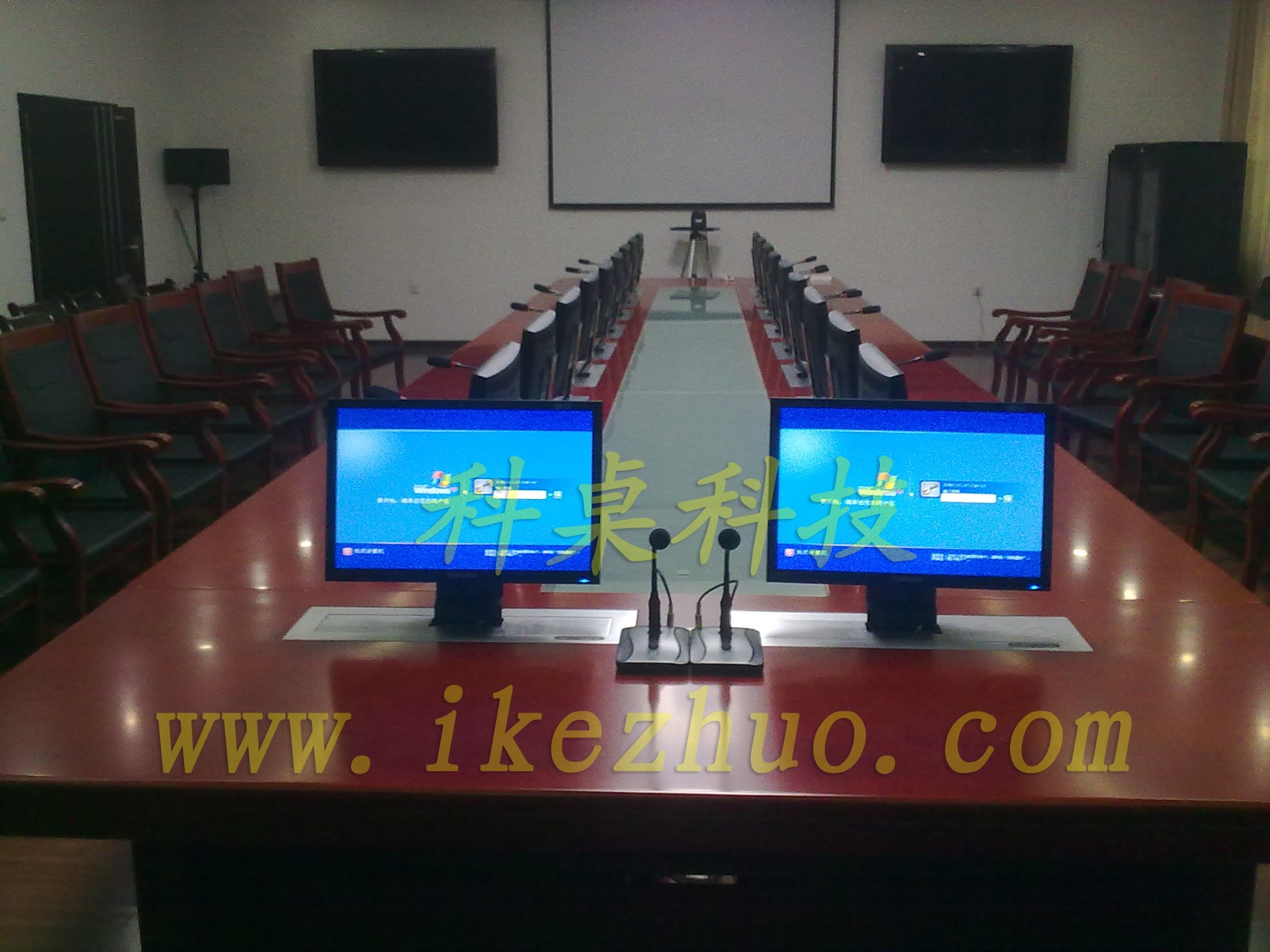 需要使用顯示屏時,隱藏在會議桌內部的升降機把顯示屏從會議下面升到桌子表面;當不使用顯示屏時,升降機自動下降,顯示屏隱藏在會議桌內部,防盜、防塵;保持桌子表面的平整和美觀。